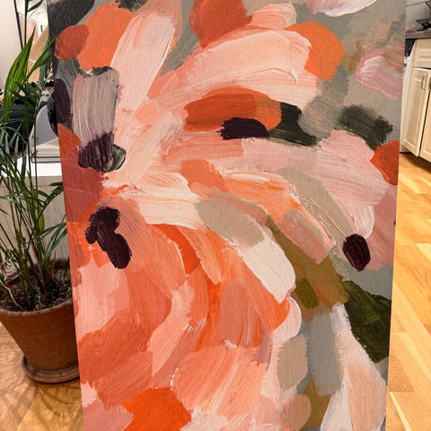 Abstrakt konstverk med färger i rosa rött och orange. Tavlan har en rektangulär form och består av olika oregelbundna färgblock i varma toner.