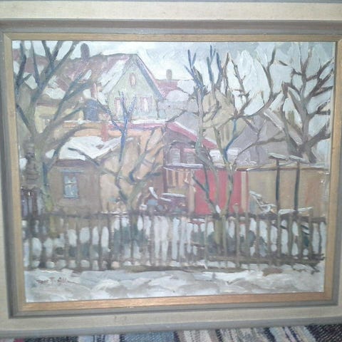 Gustaf Nyman oljemålning som föreställer ett landskap med hus och natur. Målningen är signerad av konstnären Gustaf Nyman och har en rektangulär form med ram.