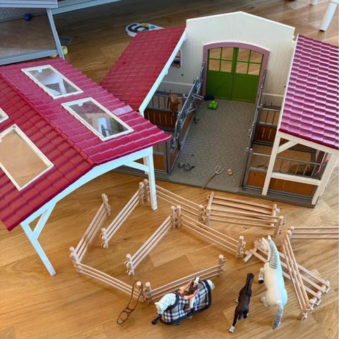 Finns hästar, föl, stall, hästboxar, staket, mat, djur, hinder och mycket mer.
