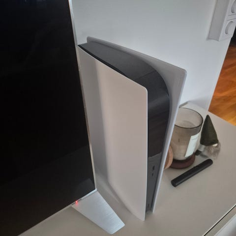 Sony PlayStation 5 Digital Edition spelkonsol utan skivläsare. Konsolen är designad för digitala spel och har en modern vit och svart färgkombination. Passar för användning med PlayStation 5-spel och tillbehör.