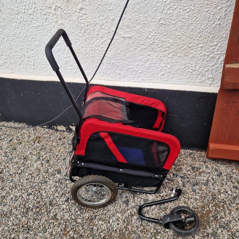Cykelvagn i svart och grå färg, avsedd för transport av husdjur. Vagnen har ett robust ramverk med en dragstång för anslutning till cykel. Den är utrustad med fönster och öppningar både fram och bak.