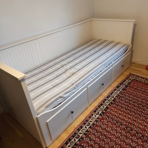 Dagbädd IKEA Brimnes. I nyskick. Praktisk gästsäng som dubblerar som soffa dagtid. Två sovplatser när utdragen. Rymlig förvaring i de två lådorna. Säljes på grund av flytt. Använd färre än 10 gånger.
