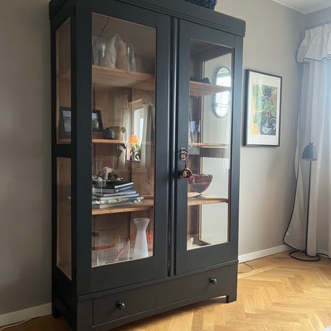 Lantligt vitrinskåp målad med antikgul, gul antik, från Jotun. Insidan är målad i en vit nyans, socker, från Beckers. Perfekta skåpet till det lantliga köket och hemmet som söker snygg och praktisk förvaring. Skåpet är renoverat, målat och har försetts med nya kromade knoppar.