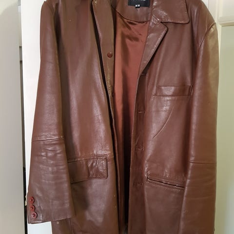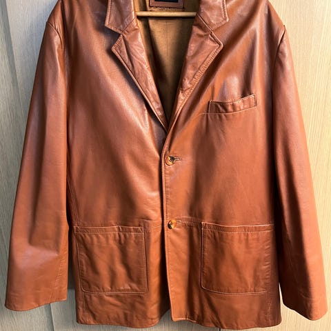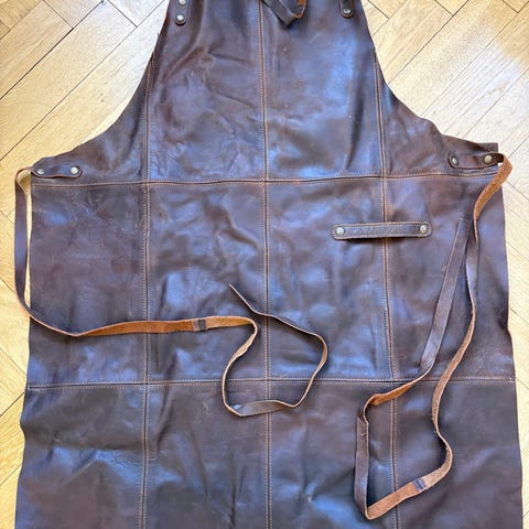 Brunt, robust läderförkläde till matlagning eller hantverk.