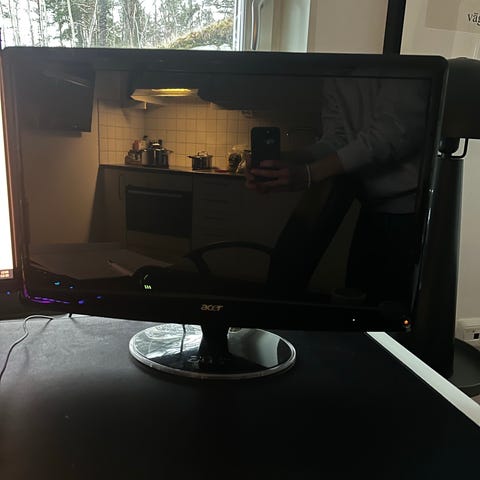 Samsung 24 tum bildskärm med HDMI- och VGA-anslutningar. Skärmen är svart och har en inbyggd strömadapter. Passar för användning med datorer och andra enheter som stöder HDMI eller VGA.