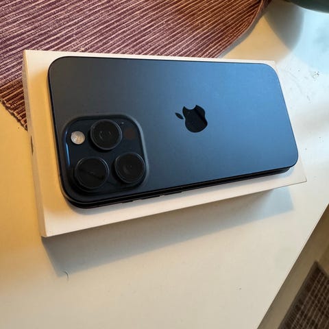 Apple iPhone 15 Pro Max mobiltelefon med 256 GB lagringskapacitet. Enheten är utrustad med avancerade kamerafunktioner och en stor skärm. Levereras med iPhoneförpackning, laddningskabel och SIM-kortverktyg. Telefonen har en mörk gråblå färg och är tillverkad med högkvalitativa material.
