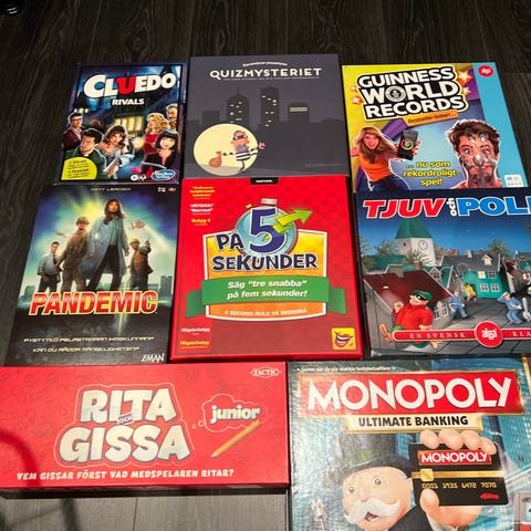 En samling brädspel inklusive Monopoly, Kalaha, UNO Spin, Lista Rätt, På 5 Sekunder, Diamanten, Geni Classic, Family Pursuit och Mastermind. Spelen har olika spelstilar och regler, lämpliga för familje- och sällskapsspel.