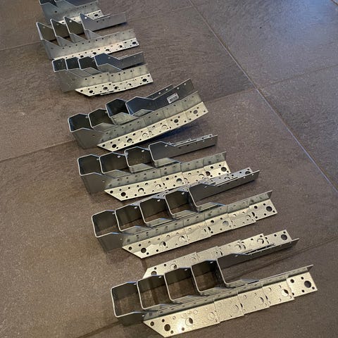 Metallbeslag vinkelbeslag för byggkonstruktion med flera hål för skruvar eller spikar. Används för att förstärka och fästa trä- eller metallkonstruktioner med måtten 45 x 95 mm