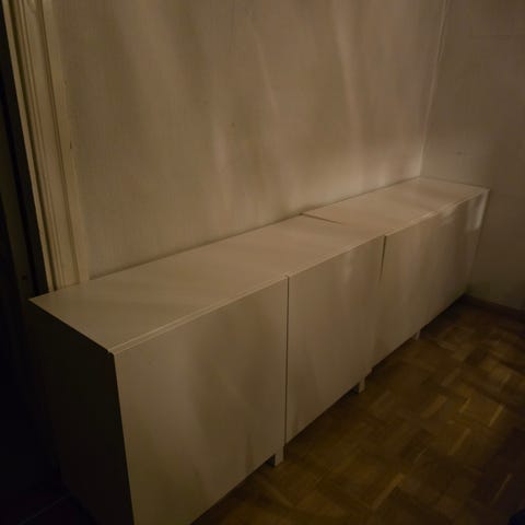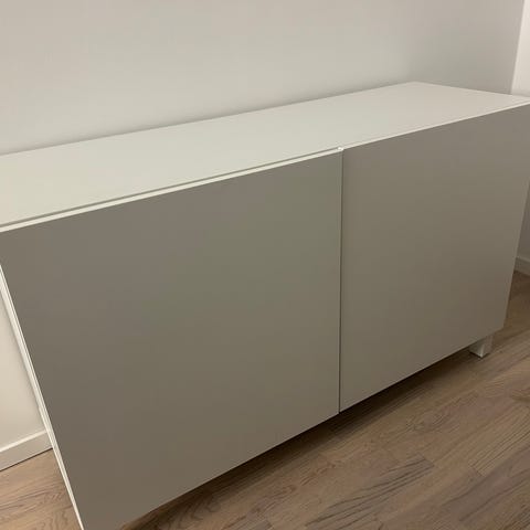 BESTÅ hylla med dörrar. Luckor i högglans, toppskiva i glas samt väggfästen medföljer.