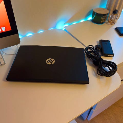 HP Omen bärbar dator med röd bakgrundsbelyst tangentbord och NVIDIA-grafikkort. Svart färg med en design som riktar sig mot gaming och högpresterande användning.