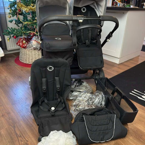 Säljer en syskonvagn med två sittdelar, en liggdel samt tillhörande väska som man kan sätta dit om man använder den som en monovagn. Regnskydd ingår. Köptes nyligen begagnad med säljes nu pga felköp.