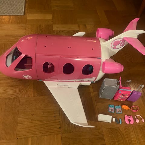 Barbie Flygplan leksak i rosa och vitt. Leksaken har öppningsbara delar och utrymme för dockor och tillbehör. Passar för barn som gillar rollspel och flygplanslekar. Vissa småsaker kan fattas mot nyskick.
