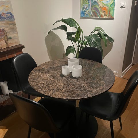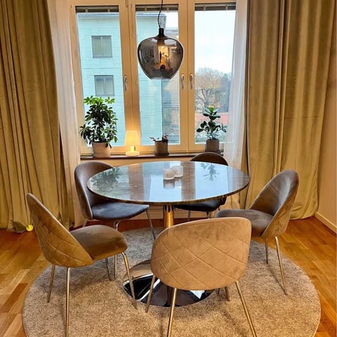 Säljer mitt marmorbord med 4 gråa sammetsstolar. Köpt för 4 år sedan.