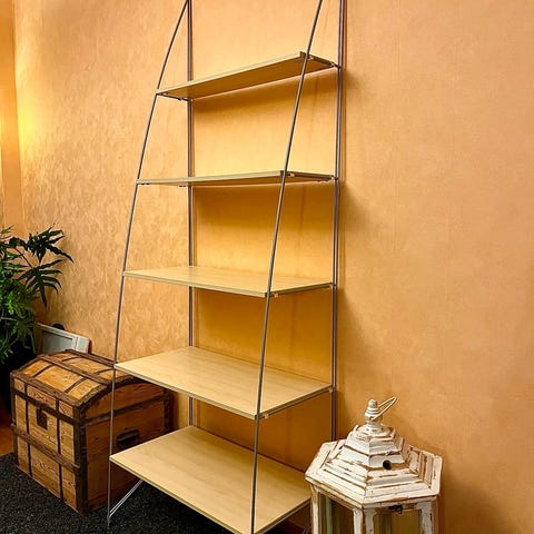 Äldre stringhylla med hyllplan som är täckta av ny dekorplast. Hyllplanen är väldigt fina. Ett hyllplan har extra skruvhål på baksidan, se bilder.