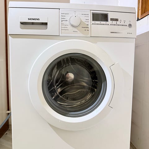 Vit UPO Frontmatad tvättmaskin. Maskinen har en användarvänlig kontrollpanel med vred och knappar för olika programval.