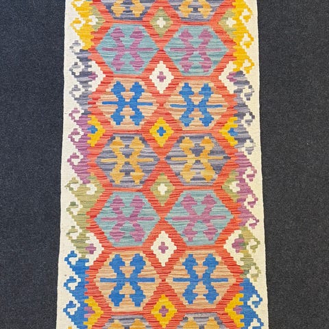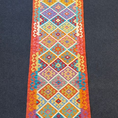 Vacker handvävd Kelim-matta tillverkad av 100% ull i multi färger, mått 294 X 84 cm. Hantverksmässigt vävd av Turkmener i norra Afghanistan. Helt ny och i oanvänt skick.