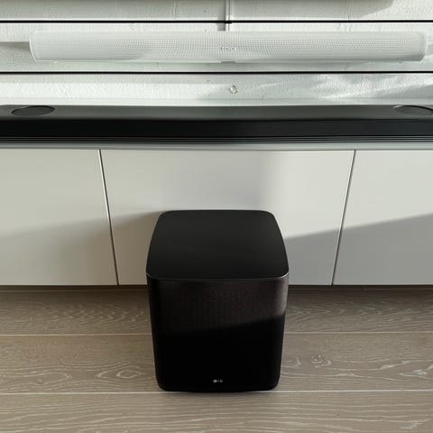 LG Music Flow ljudbar med trådlös anslutning via Bluetooth. Utrustad med flera kontrollknappar för volym och ström. Ljudsystemet är kompatibelt med Dolby Digital, DTS och har stöd för HDMI-anslutning. Färg: silver.