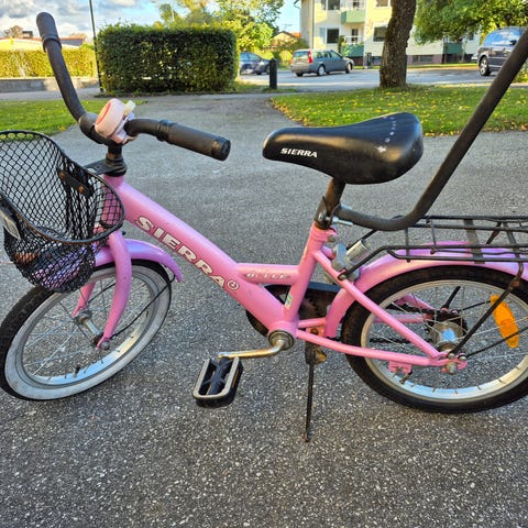 Barncykel med 12 tum hjul i rosa färg. Utrustad med en korg framtill, stödhjul och en bakre handtag för enkel styrning. Passar för yngre barn som lär sig cykla.
