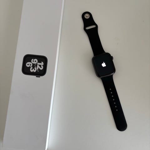 Apple Watch SE (2022 ) smartwatch med 40 mm storlek i silver aluminium. Klockan har en vit sportarmband och är utformad för att användas av alla kön.