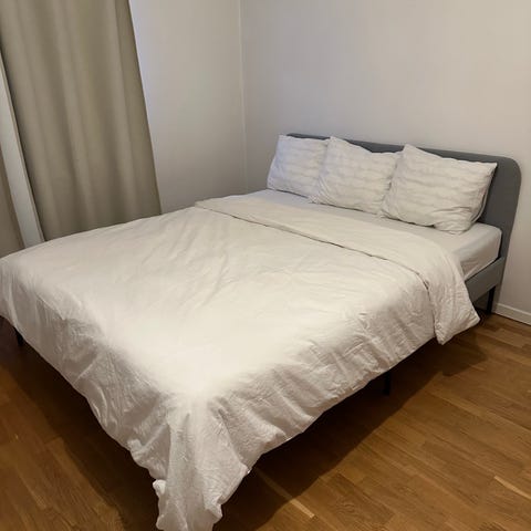 En platta i ribbotten är trasig, men detta påverkar inte användningen och märks inte när man sover. Sängen är fullt fungerande.