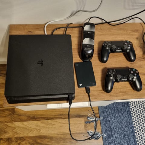 Säljer en PS4-konsol med uppgraderad lagring till 2 TB hårddisk. Konsolen är nyligen rengjord från damm och har fått ny kylpasta, vilket ger tystare och svalare drift.