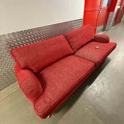 Soffan hämtas på plats 2tr, det finns ingen hiss. Soffan är nätt och ganska lätt när kuddarna är borta så två personer räcker. Benen går att skruva av.