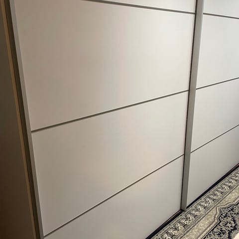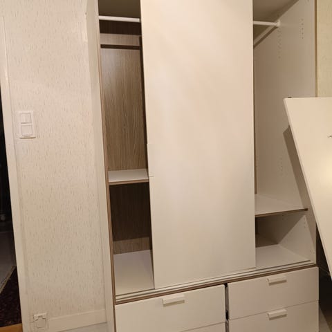 Snygg och mycket rymlig garderob med modern design, två skjutdörrar med med speglar. Inköpt för ett år sedan men aldrig uppackad, ligger kvar i orginal kartong pga flytt. Helt ny!