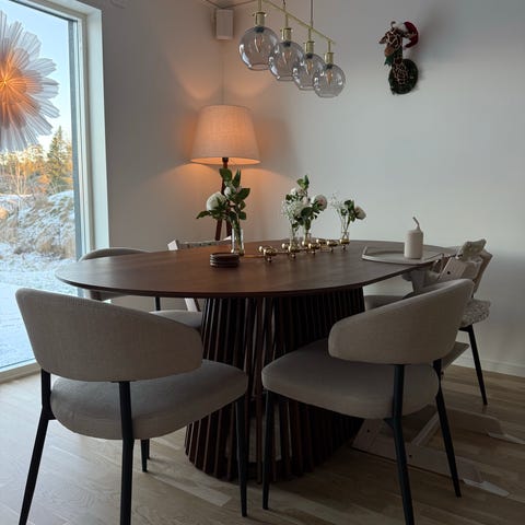 Bordet har en inbyggd förlängningsskiva som är dold under bordsskivan. Bordet är i bra skick med endast två små märken på ena kortsidan som kan behandlas och det finns en uppsättning helt oanvända skivor som ingår om man önskar att bordsskivan ska vara helt ny och oanvänd. Nypris för bordet i affären Bo Concept med endast 1 skiva är 24 000 kr. Detta säljes för totalt 10 000 kr.