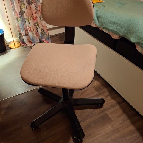 Höj- och sänkbar snurrstol. Har vaddering i sitsen och ryggstödet.