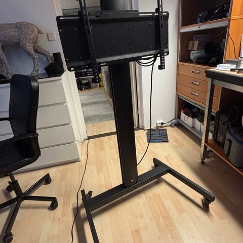 Justerbart tv stativ med hjul och integrerat eluttag. Stativen har en vit bordsskiva och en stabil metallbas med fyra hjul för enkel förflyttning. Eluttaget är monterat på ram för smidig anslutning av elektronisk utrustning.