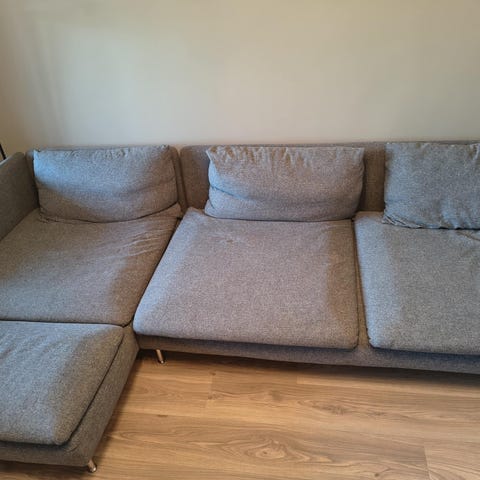 Soffa med divan / schäslong. Mörkgrå 3-sitssoffa från Stalands / Svenska Hem. Kan användas som hörnsoffa. Ben i svart metall. Kuddarna har avtagbart tyg.