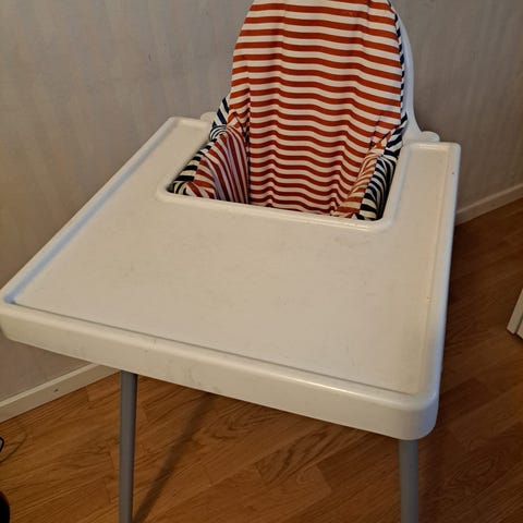 IKEA Barnstolar barnstol med blått tyg och vit ram. Stolen är anpassad för barn och har hjul under basen för enkel förflyttning. Klädseln är i blått tyg och ramen är vitmålad.