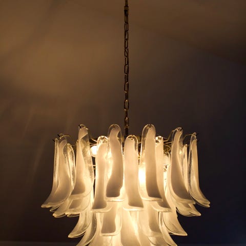 Taklampa i handblåst Muranoglas med en metallkedja för upphängning. Lampan har en rund, genomskinlig glaskupa och en kedja av metall i svart och silverfärgad design. Passar för takmontering och ger ett mjukt, diffust ljus.