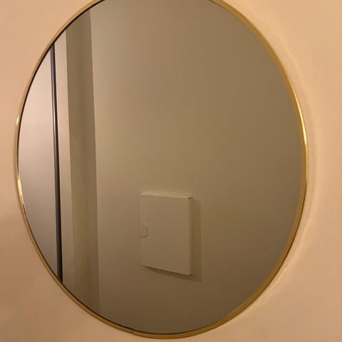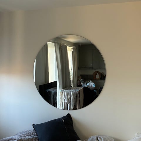 Runt spegel med enkel design. Spegeln har en rund form och saknar ram, vilket gör den lämplig för olika inredningsstilar.