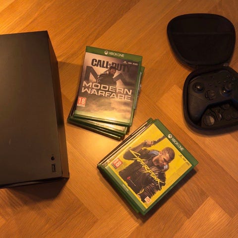 Säljer ett Xbox Series X med diverse tillbehör. Inkluderar konsolen, 2 handkontroller och ett headset.