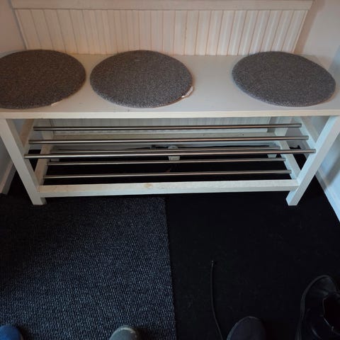 Sammantaget så är detta en snygg och charmig samt praktisk hallmöbel / klädhängare med skoförvaring. Mindre slitage och märken av användning finns men detta är inget som påverkar möbelns funktion. Aktuell pris är satt med hänsyn till detta.