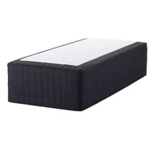 Resårbotten, mörkbeige med bäddmadrass och madrassskydd.