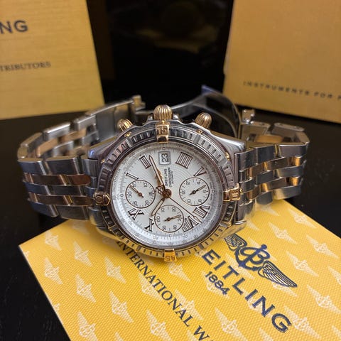 Breitling Old Navitimer rdf B13019 - 1993 , 42mm guldbezel , guld/stål pilotarmlänk , väldigt fint skick . Box , låda , äkthetsintyg från kaplans , extra orig läderarmband .