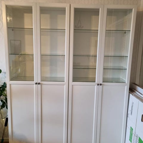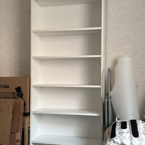 Helt ny Billy Oxberg bokhylla med knoppar som är utbytta till guldfärgade.