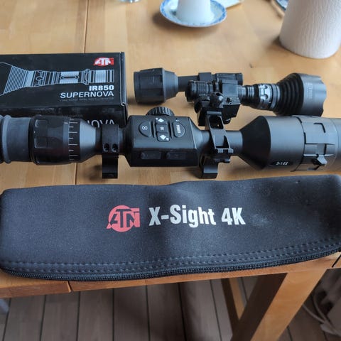 Komplett sätt nattsikte och värme kamera. Atn X-sight 4 K pro 3-14x och Hikmicro Lynx LC06 värmekamera med tillbehör. Siktet levereras med kablar och monteringsdelar.