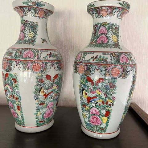4-6 handmålade keramikkrukor med blomsterdekor i gula och blå färger. Den ena vasen är rund med blå och gröna blommor, den andra är hög och smal med blå och röda blommor på gul bakgrund. De andra har lite andra nyanser.