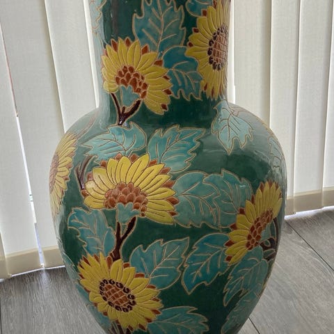 Handmålad keramikvas med blomsterdekor, gul och blå