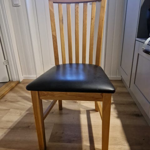 Säljer en uppsättning om 6 st klassiska matstolar i massiv oljad ek med ribbad rygg och bekväma sitsar klädda i svart konstläder. Stolarna är i gott begagnat skick med endast normalt bruksslitage och inga större skador. 600kr för alla 6 stolarna,