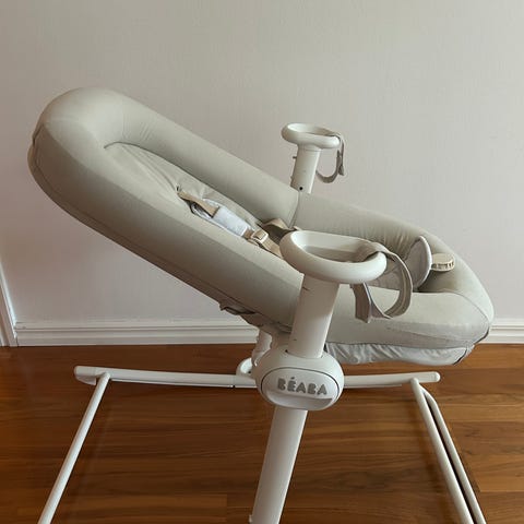 Stokke Steps barnstol med justerbar lutning. Tillverkad i plast och textilmaterial, designad för barn. Stolen har en stabil konstruktion och är utrustad med funktioner för att anpassa sittpositionen.