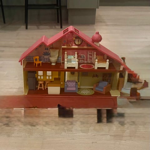 Sylvanian lekstuga med blått tak och veranda i naturligt träutförande. Lekstugan har två våningar med flera fönster och dörrar. Passar för barnlek och inredning med små möbler eller dockor.