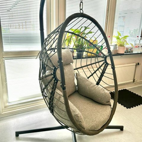 Säljer min fantastiska hängstol i samband med flytt till Nya Zeeland. Denna modell (Sorrento från Rusta) är otroligt bekväm och har den eftertraktade U-formade foten, vilket gör den betydligt stabilare och mer lättplacerad än de vanliga runda fötterna. Perfekt för Perfekt för chillad kvällar!