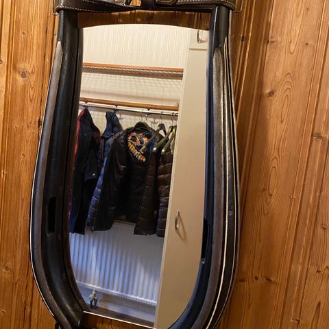 Spegel med träram och läderremmar. Höjd 90 cm bredd 45cm.