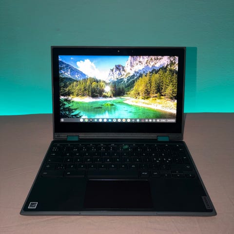 Lenovo Chromebook laptop med silverfärgad design. Utrustad med ett tangentbord och pekplatta, passar för vardagligt användande och internetbaserade uppgifter.