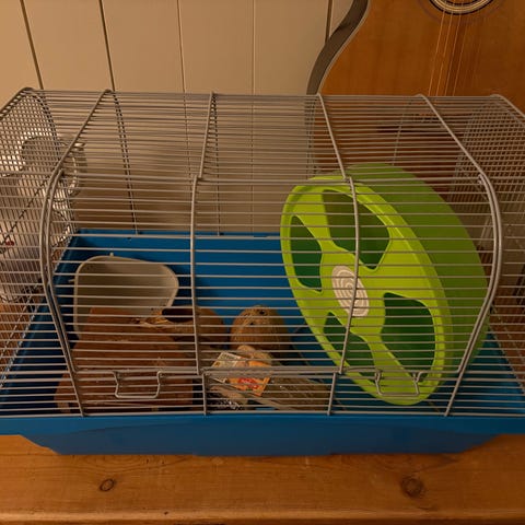 Mycket fin bur i två våningar till mindre hamster, perfekt till dvärghamster. Mått: 55x38 cm. Hämtas i Aspeboda.
