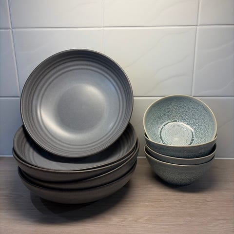 Mio servis med tallrikar och skålar i blått. Servisen består av flera tallrikar i olika storlekar och matchande skålar. Materialet är keramik med en matt blå yta och mörka kanter.